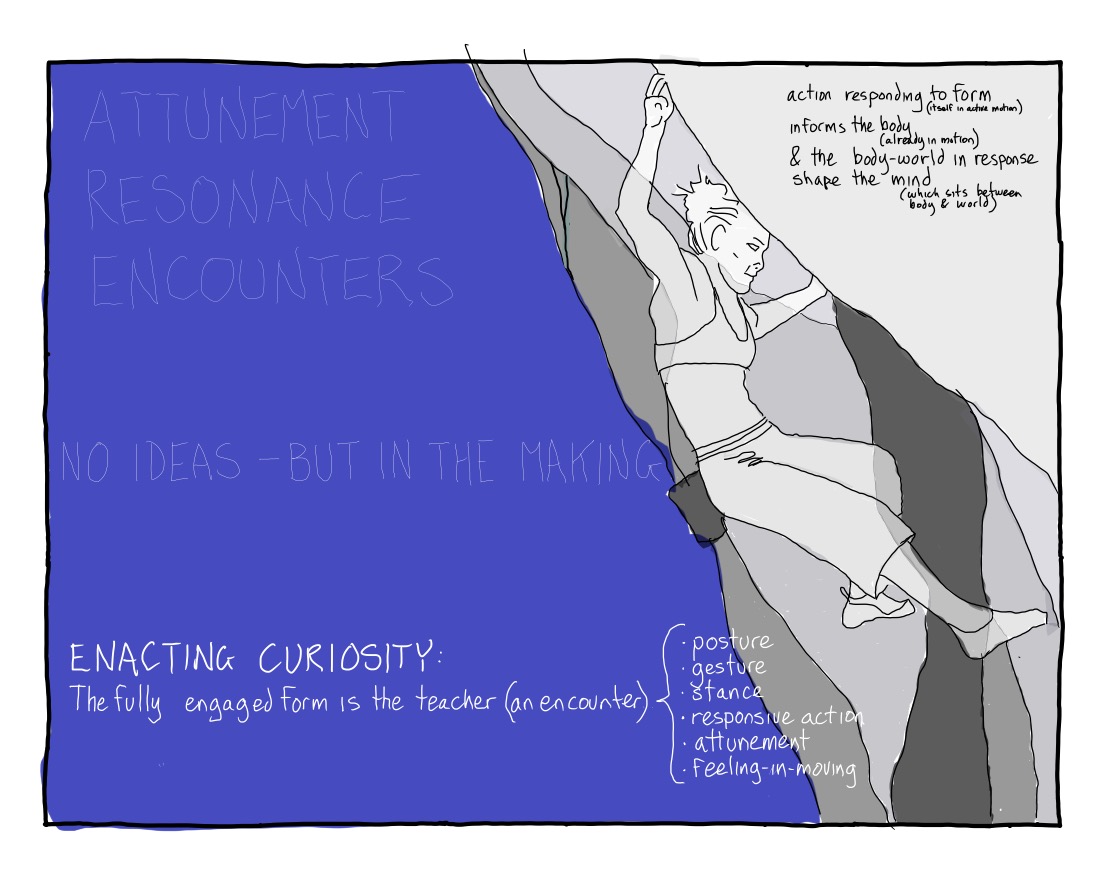 This tool, our shoe, actively mediated our embodied actions as they responded to the forms – cracks, ledges, bumps, and pockets. These forms, while being in some very general sense “always there” as a “rock face,” were brought forth into a very specific salience – relevance by having these boots. How? These boots could actively mediate between the weight of our body concentrated in our foot and a very small protuberance in the rock. And they could do this because of their stiffness and thickness. Where the flip-flop was soft and flexible, our boots are now thick and stiff. With this newly actively mediated action, our world shifted, and the rock face went from being of visual interest to being composed of distinct opportunities for a climbing action – footholds. And with the opportunities for feet also emerge handholds. This engagement of “finding” footholds (really the collaborative co-creation of stepping opportunities) then informs the body – weight is shifting in new ways, and the hips are moving the center of balance in ways that at first feels profoundly odd and deeply uncertain. Knees and ankles are bending, tensioning, sensing, and strengthening in new ways. Hands reach upward from this novel centering of gravity and tensioning of the body's core towards possible zones of grasping, pushing, and pulling. And this novel coupling of body-world shapes mental attunements. We feel-see a novel world unfolding in tune with our movements. The feeling-moving-seeing becomes an anchor: habits form.