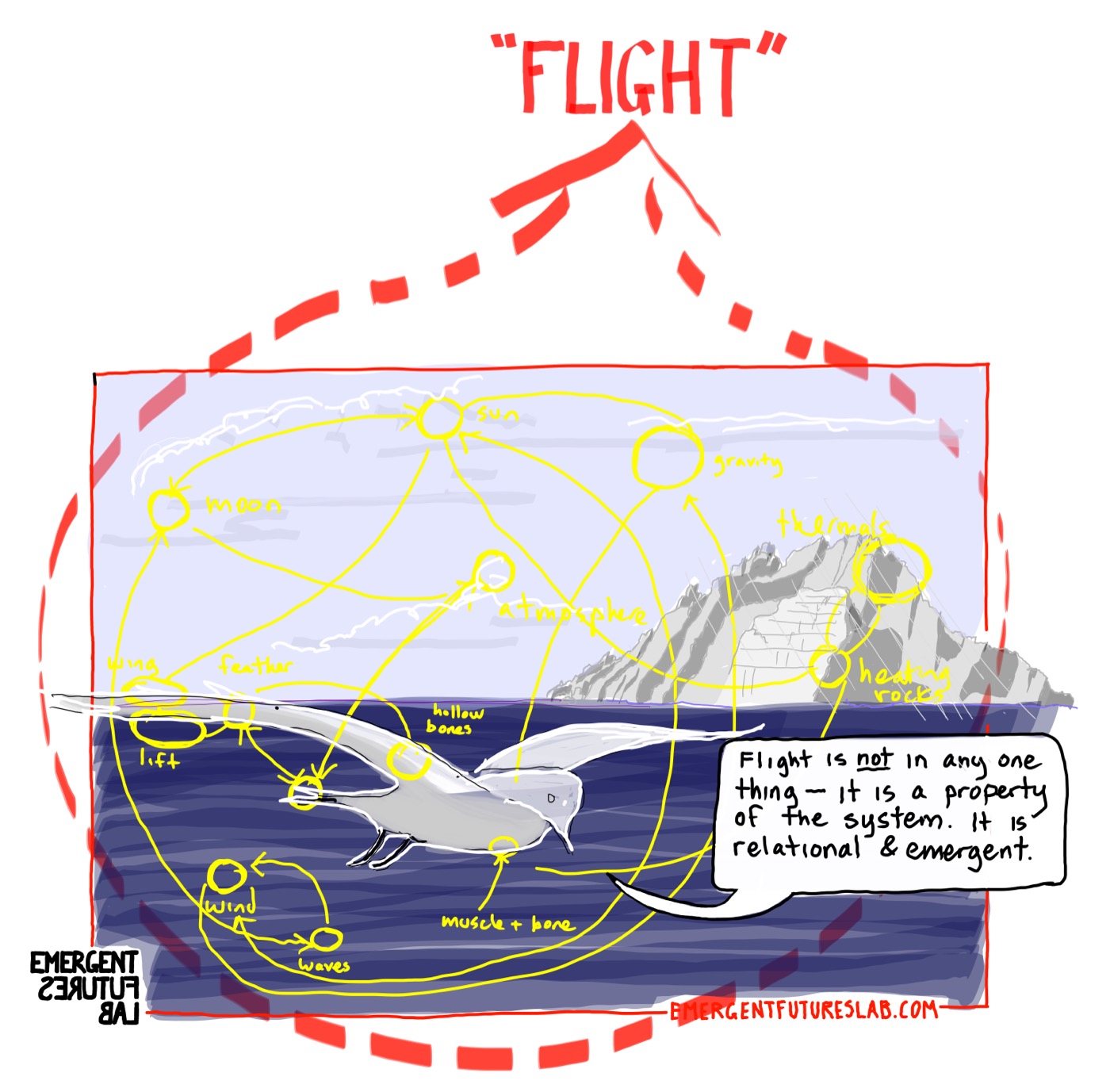 And this brings us back to configurations: Flight is the affordance (the specific emergent opportunity for action) of a configuration (of diverse agents, practices, tools, and environments interacting) that gains autonomy and creative agency via a cyclical process.