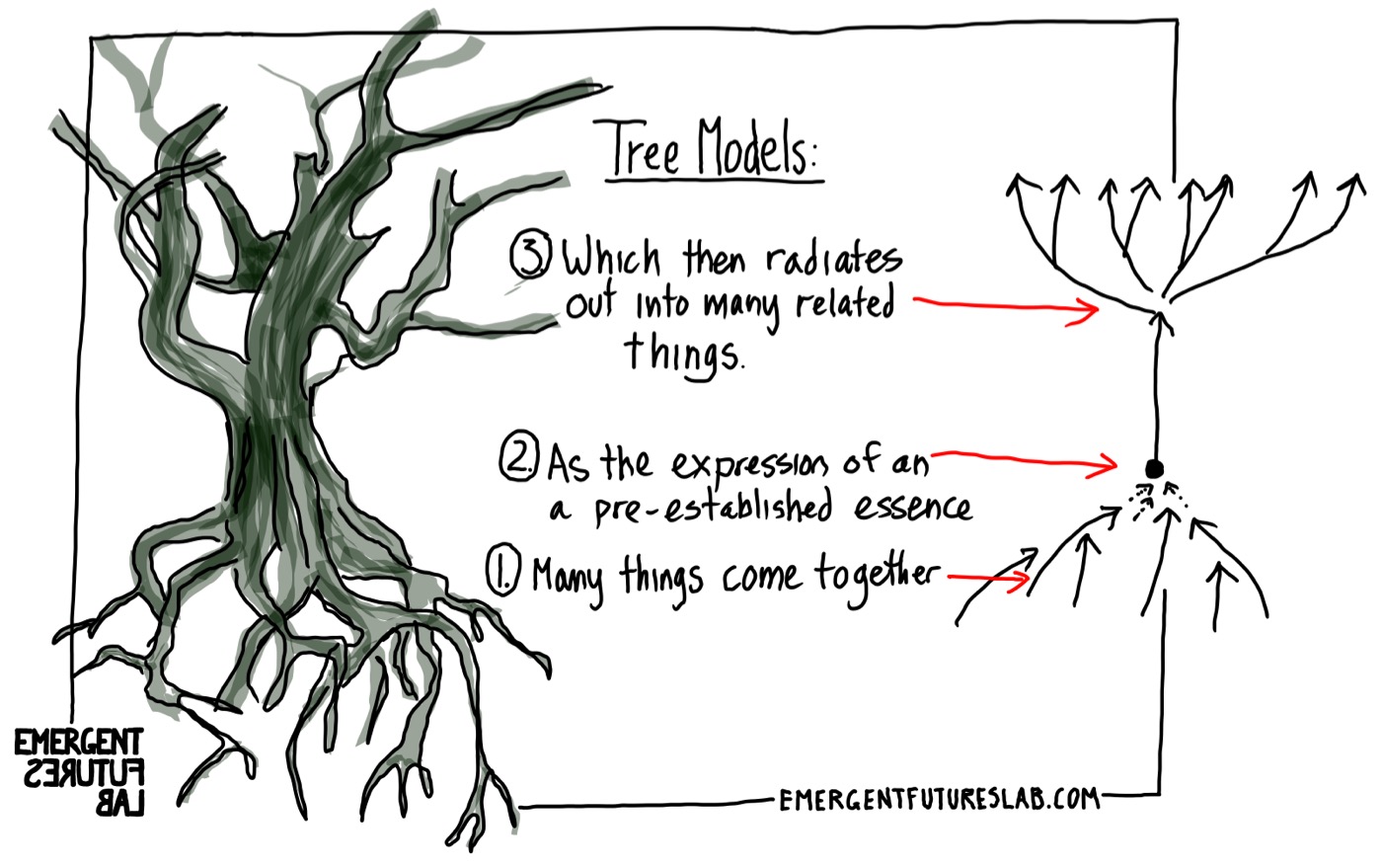 Tree models are one of the four classical and deeply problematic reductionist/essentialist ways of presenting the creative process (the others are the multi-level pyramid, the iceberg, and the onion).