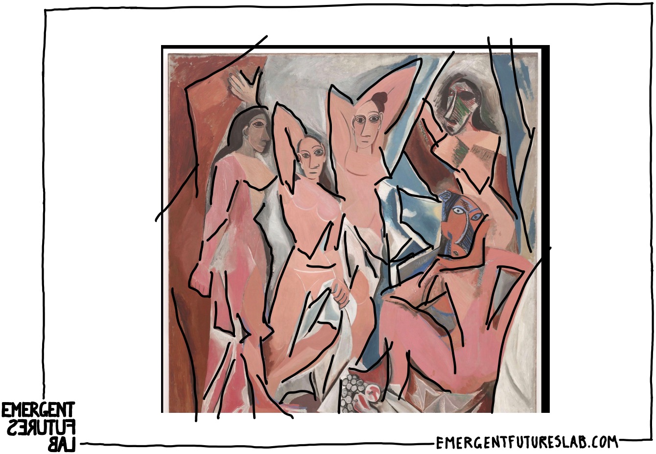 If we go back to 1906-1907 in working on this painting, Picasso makes over two hundred sketches which explore many directions, of which many do not end up in the painting process (this could have been many other quite different paintings or nothing). And when the painting is underway it changes considerably during the process – at various moments in the process there are two male figures, then a man contemplating a skull who later becomes a women, the number and posture of the women change, african masks come in and change at differing points, parts move around, forms change – nothing is quite certain – even after it was finished it changed.