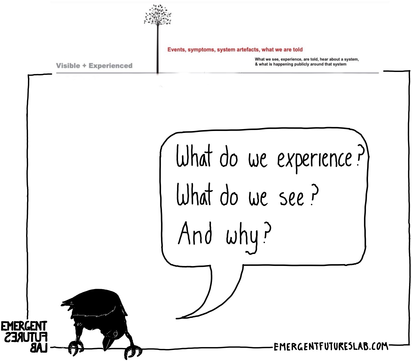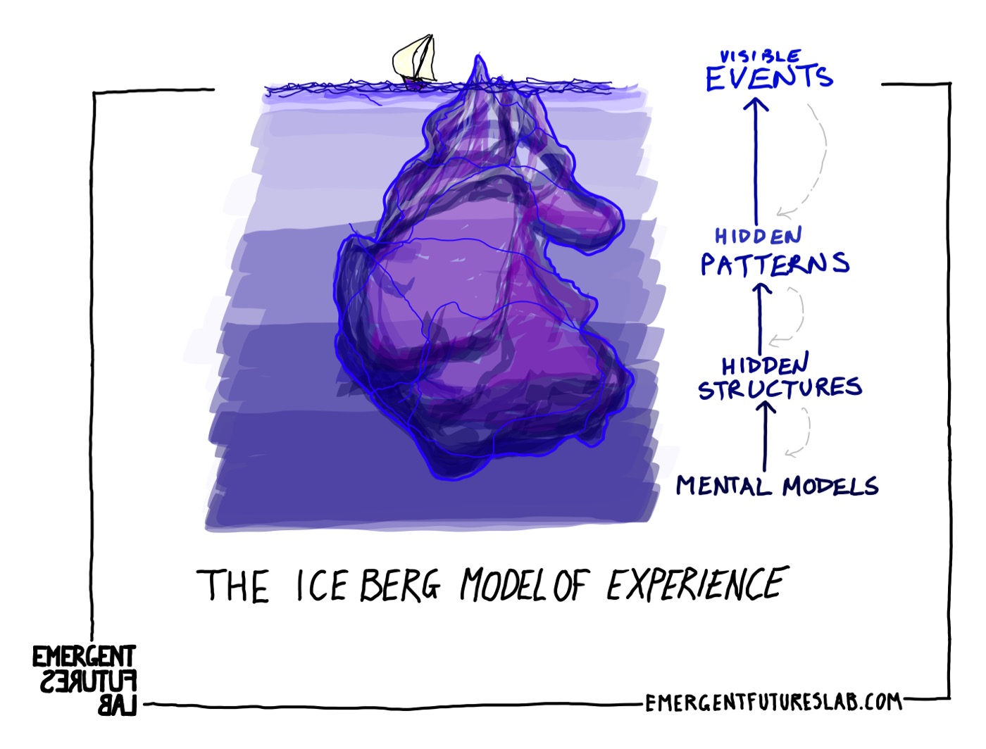 Above is an example supplied via a simple Google search on this topic. It is one example of a whole approach to explaining experience as the outcome of invisible processes and structures. This approach is pervasive – from Marx and his logic of Base and Superstructure to the work of Business Consultants like Senge, all the way to the work of systems thinkers like Donella Meadows. In each case, the visible is explained/constructed by invisible forces that cause it. Thus, what gives rise to our perceived experiences is built layer upon layer – starting just below the visible with patterns that are themselves the outcome of structures which are themselves the outcome of practices, which are themselves, as we go further and further down the layers, down until we get to mindsets and values: