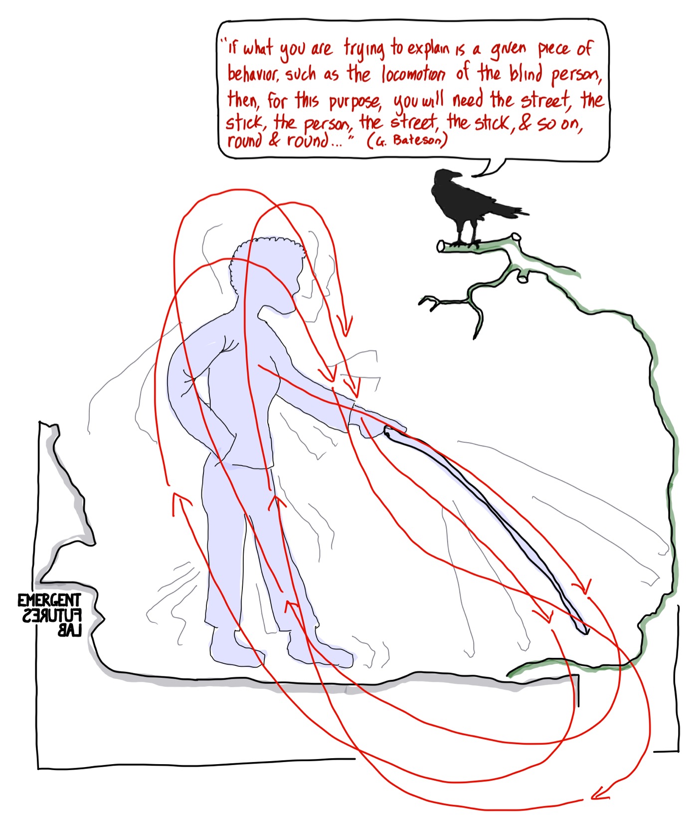 Last week we reintroduced one of our favorite examples to build from “the tick to the stick” and arrive at something like the beginnings of understanding our worlding practices in anything like concrete detail. And that is the example of a blind person and a stick. Here we draw from Gregory Bateson’s example – but there are others, the phenomenologist Maurice Merleau-Ponty being perhaps the most famous.